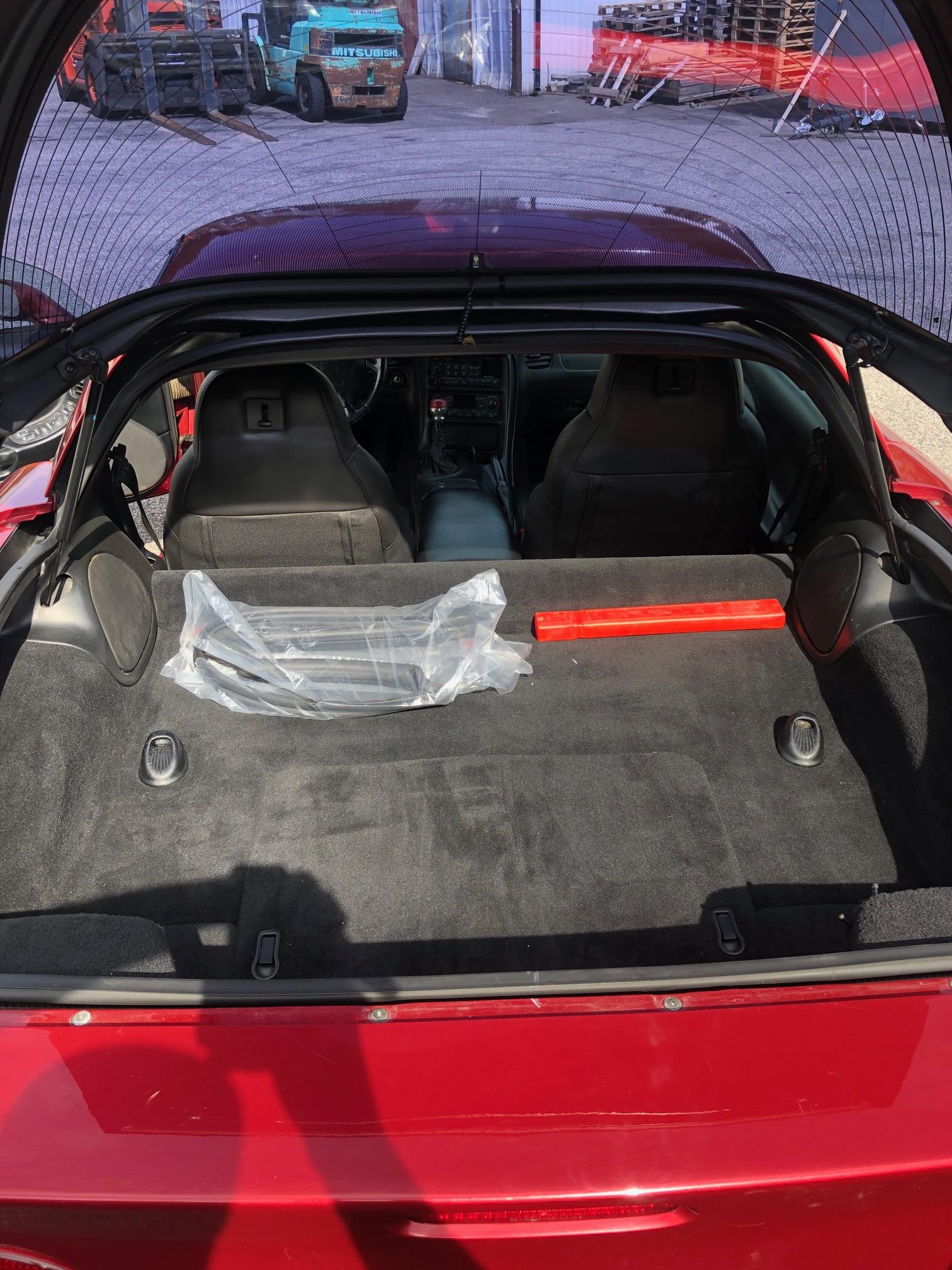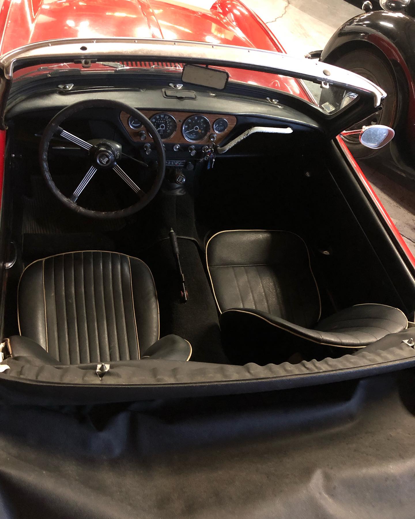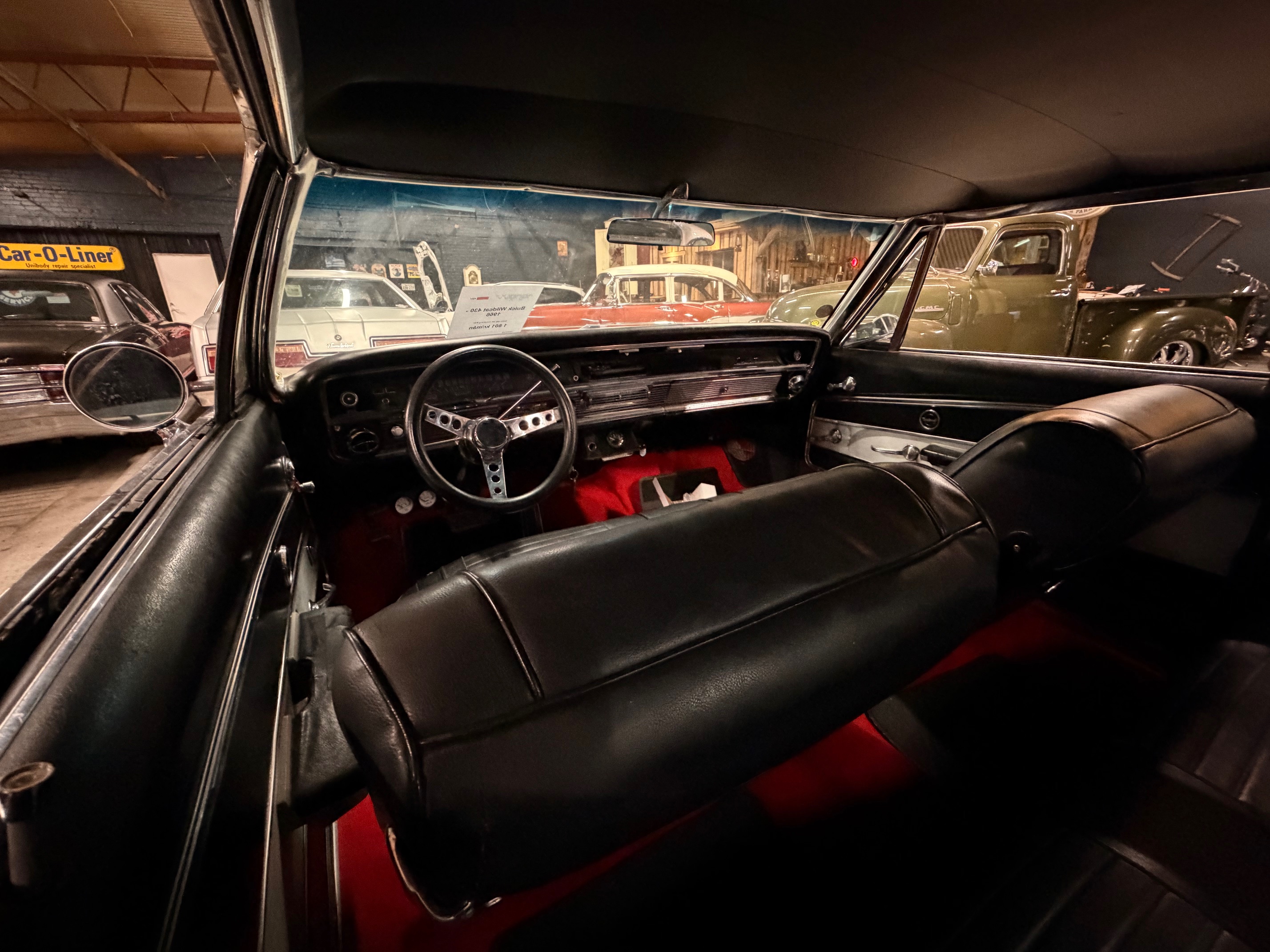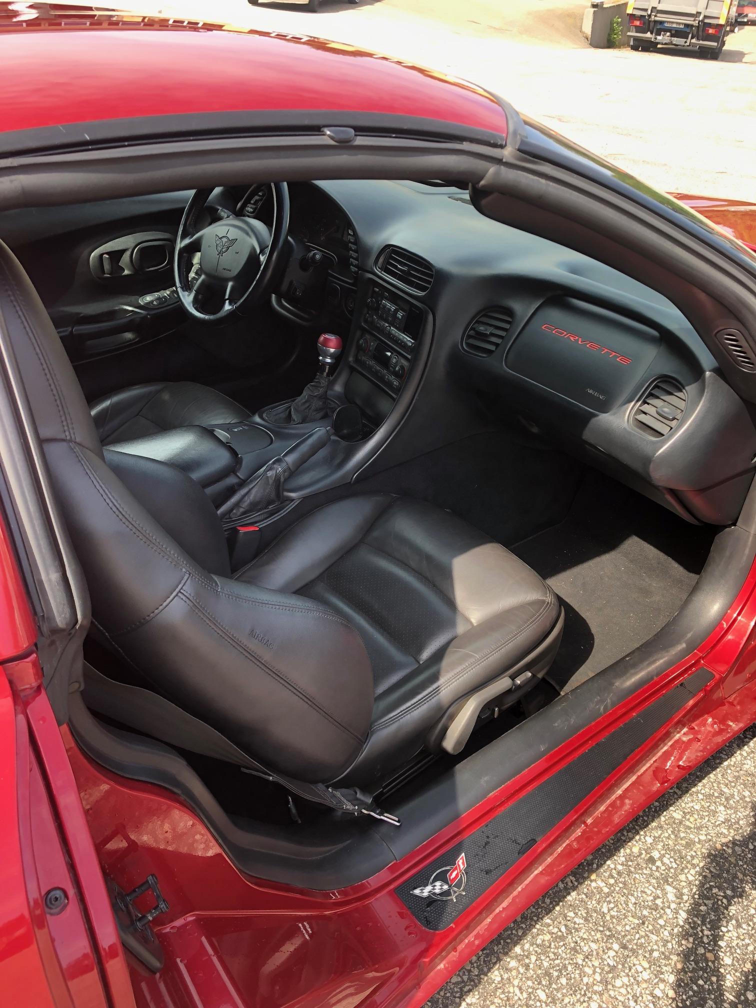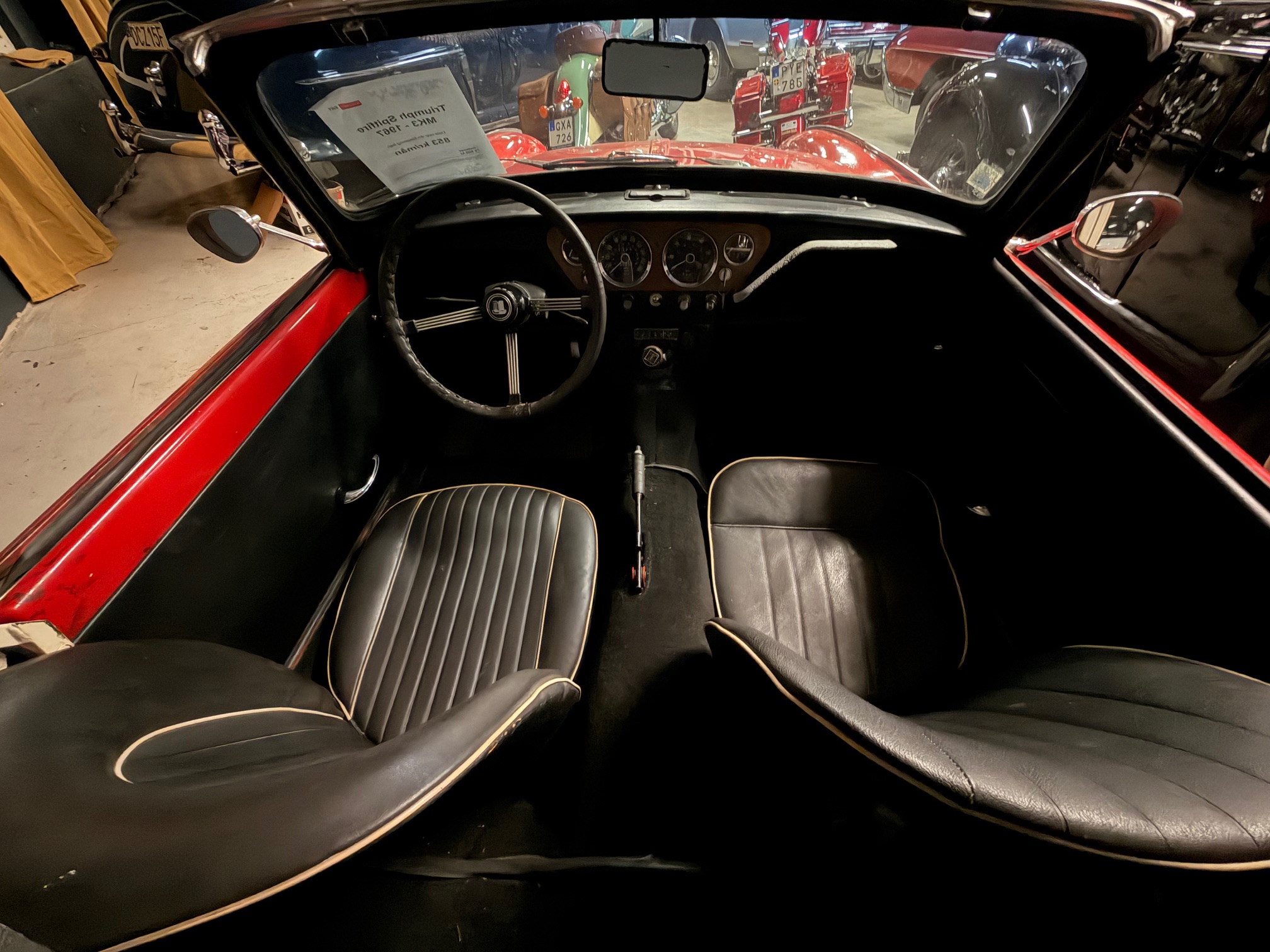 Röd skinninredning med bucket seats.