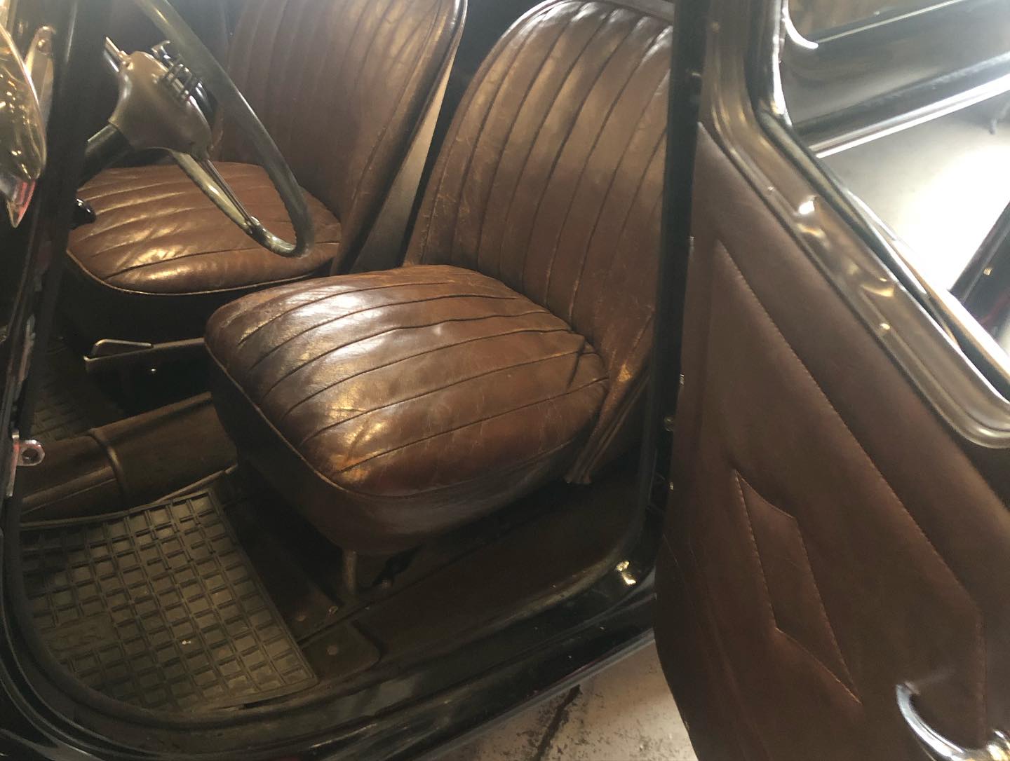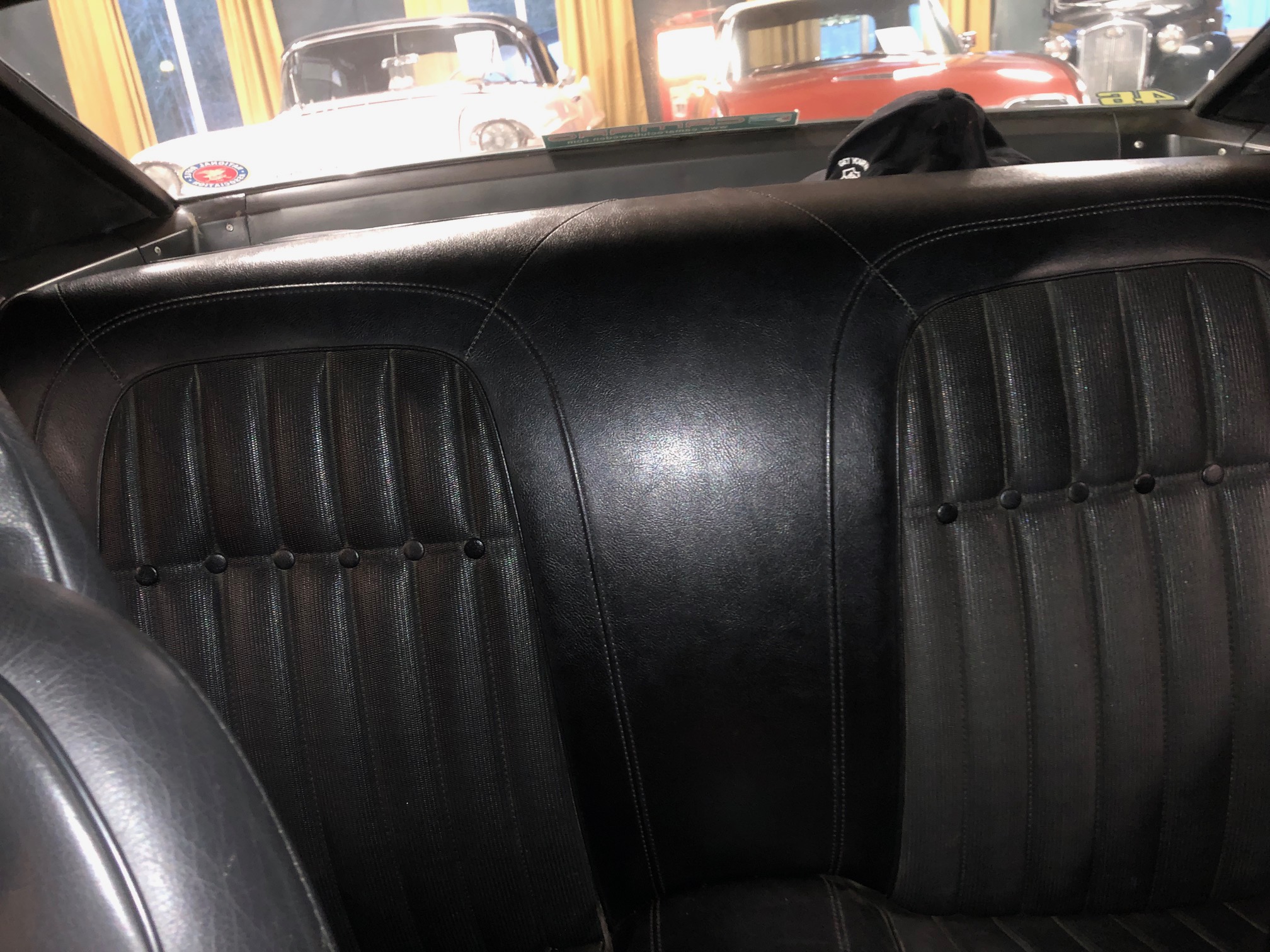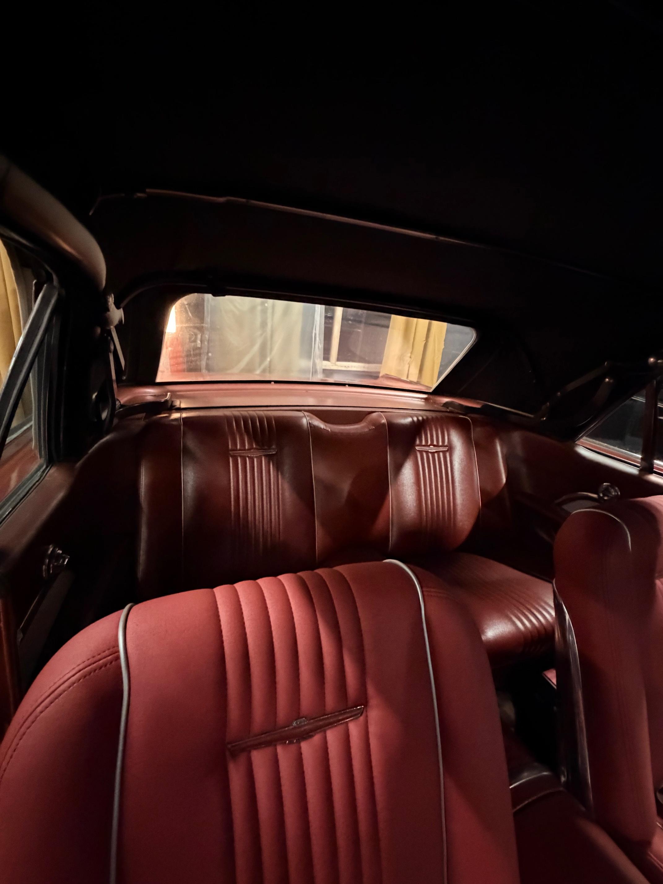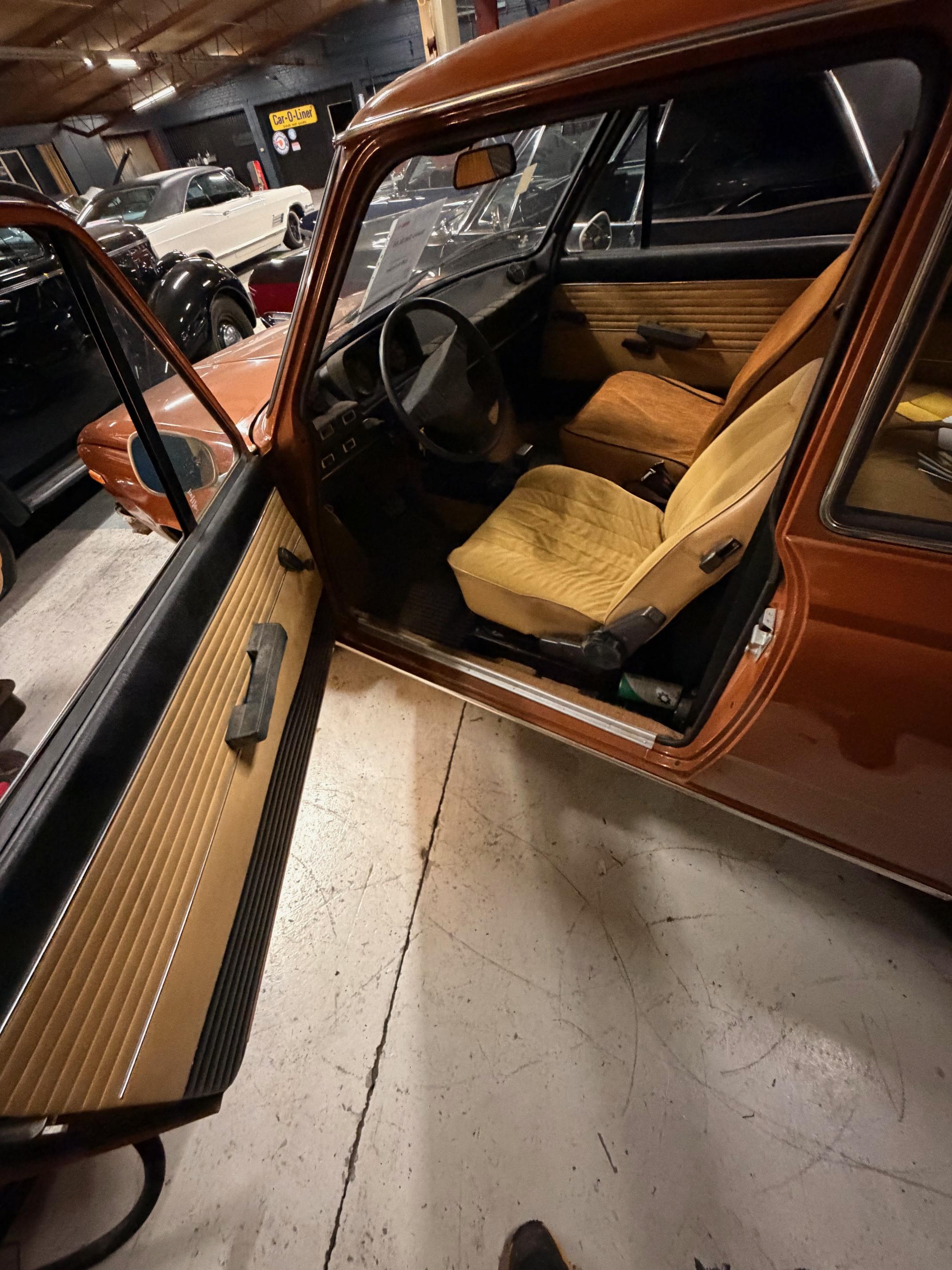 Karossen är i ett hyfsat gott skick och inredningen känns som en möbelgrupp från Chesterfield.