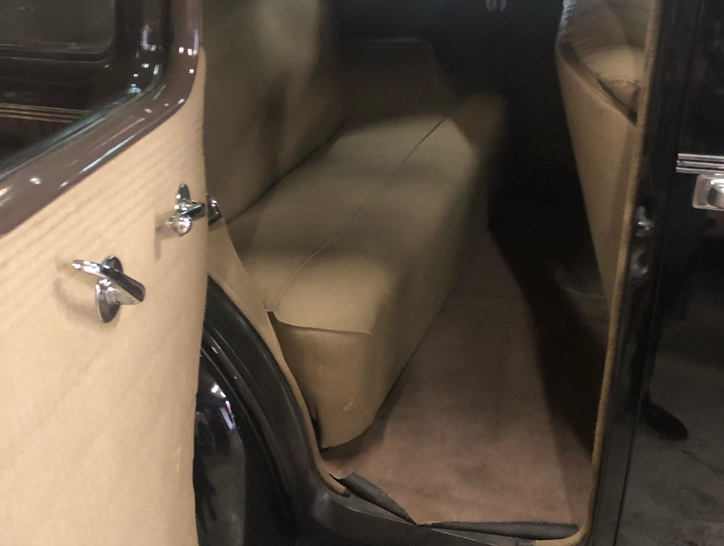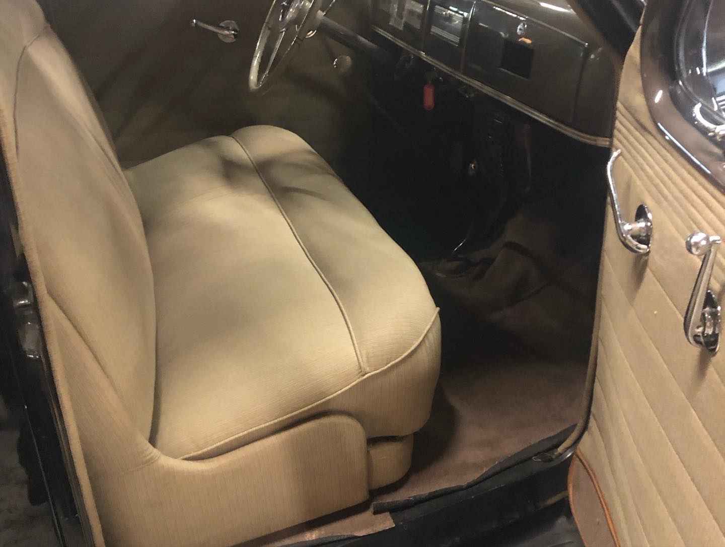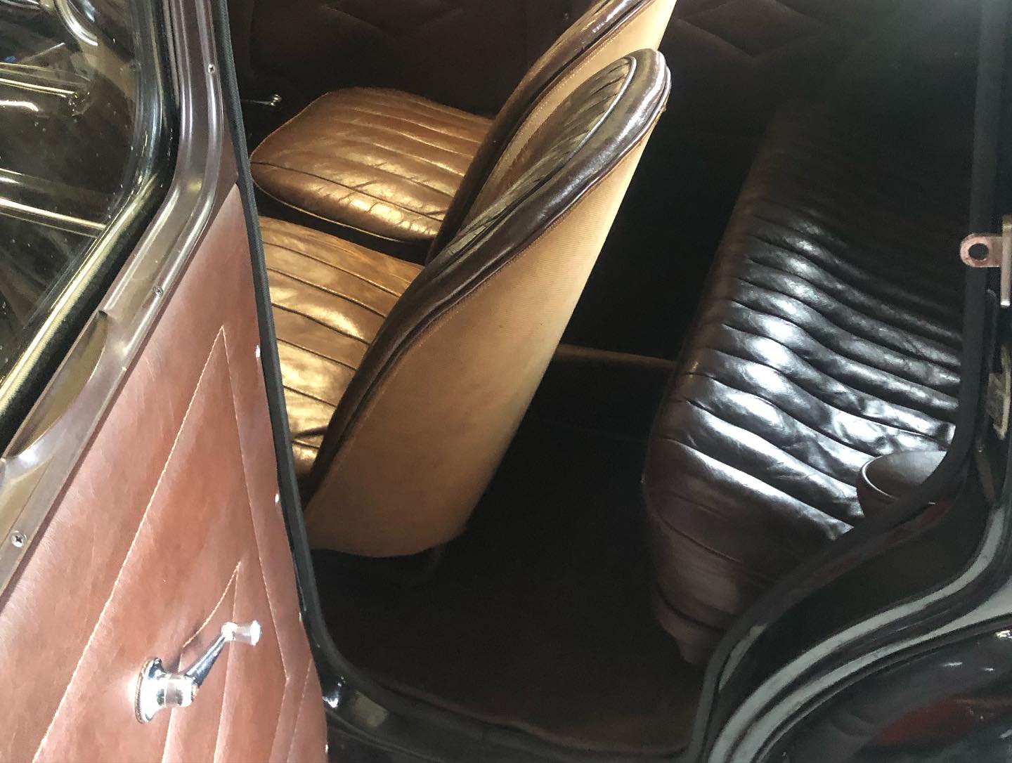 Karossen är i ett hyfsat gott skick och inredningen känns som en möbelgrupp från Chesterfield.