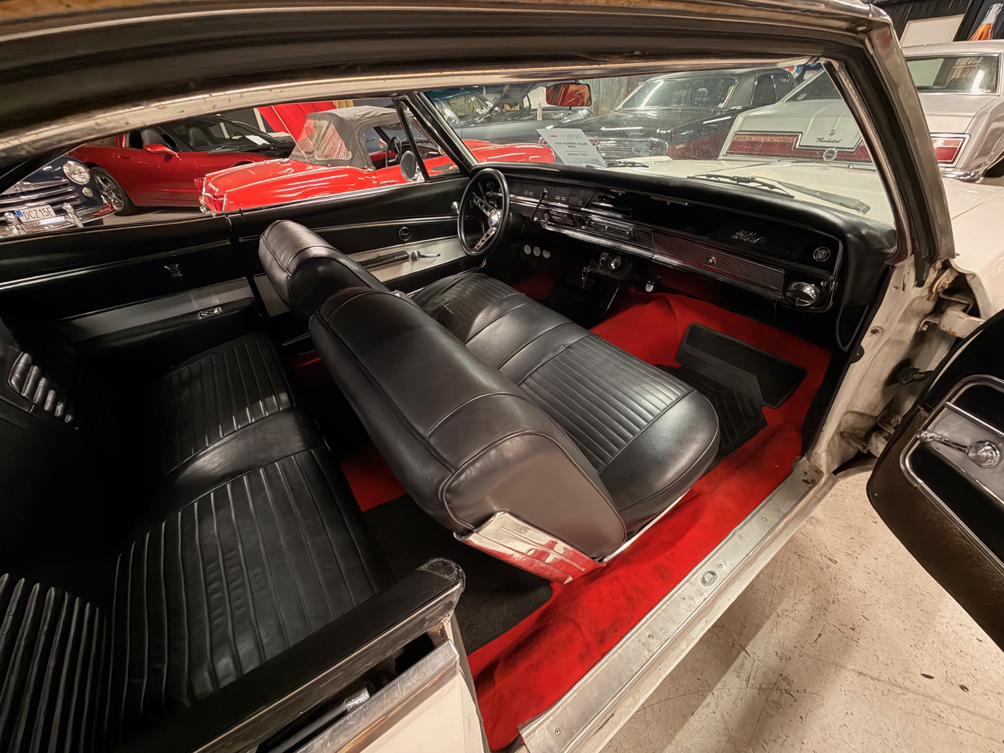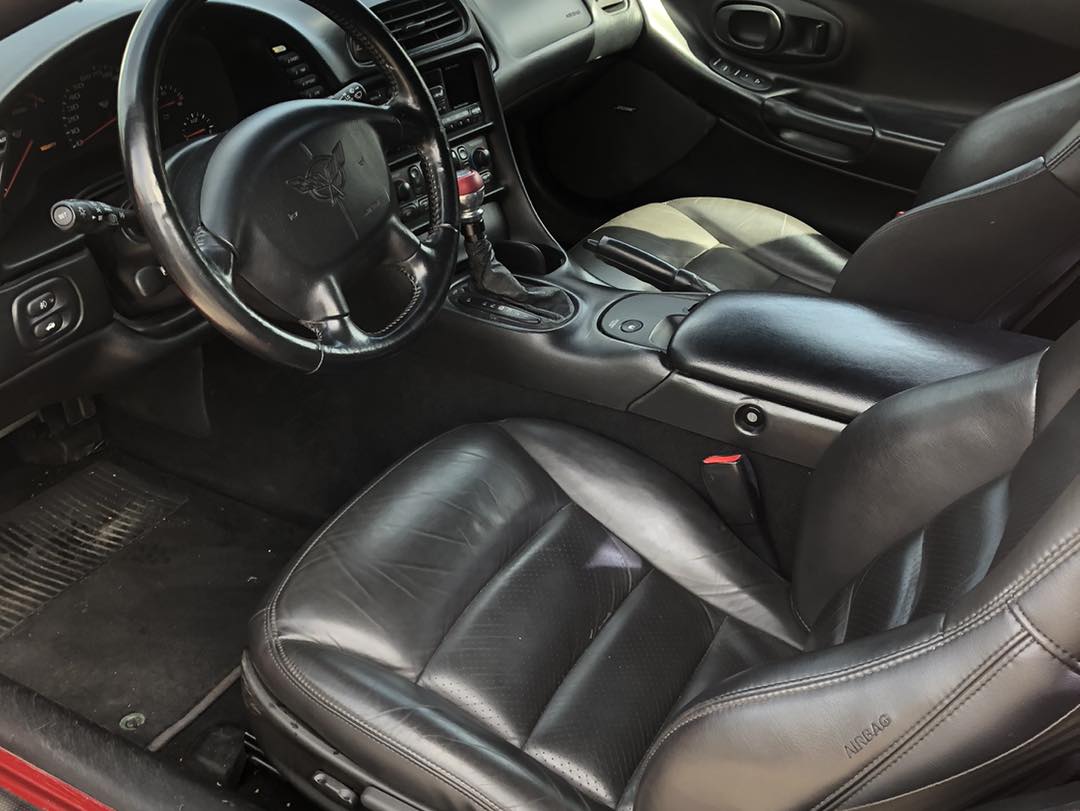 Röd skinninredning med bucket seats.